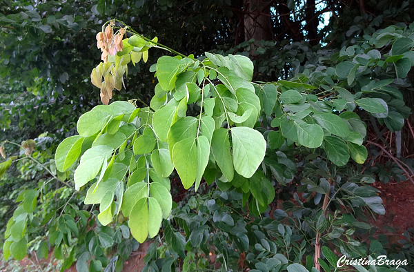 Folhas são alternas espiraladas, compostas bipinadas, geralmente com 3 pares de pinas opostas.