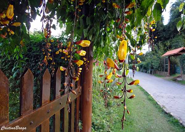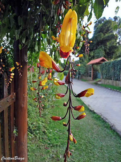 Sapatinho de Judia – Thunbergia mysorensis é uma trepadeira volúvel, da família Acanthaceae, originária da Índia, perene, de crescimento rápido, semilenhosa, vigorosa, com ramos de até 6 metros altura.