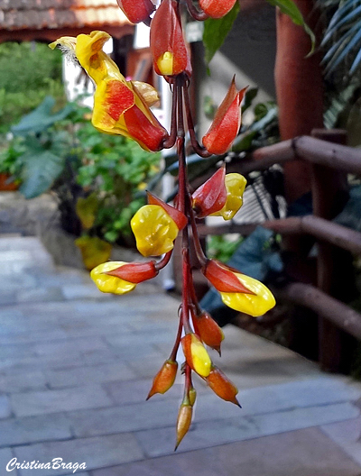 Flores amarelas e marrom avermelhado, com 5 cm de comprimento, possuem 2 lábios e uma garganta amarelada, que atuam como recipientes para chuva. A água acumulada nesse recipiente se mistura com o néctar e pólen para produzir uma bebida doce que é muito popular para pequenos pássaros e borboletas. Surgem na primavera-verão.