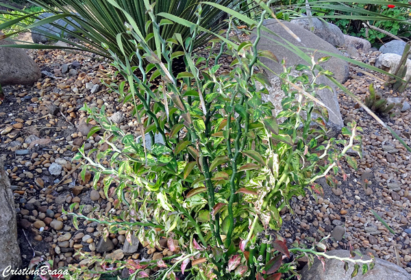 Ramos verdes, estreitos, cilíndricos, em forma de zig-zag e frequentemente sem folhas antes da floração.