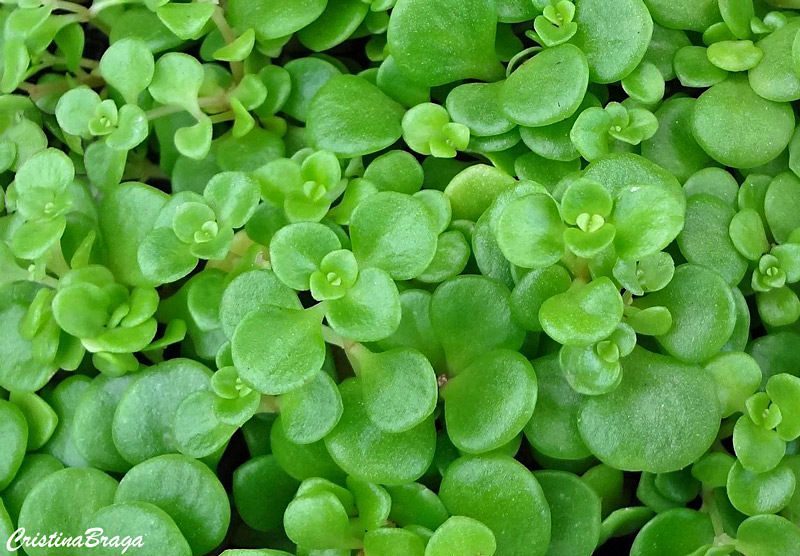 Folhas opostas, arredondadas para ovais, suculentas e brilhantes, de cor que varia do verde-escuro ao amarelado.