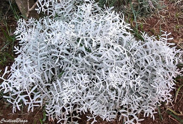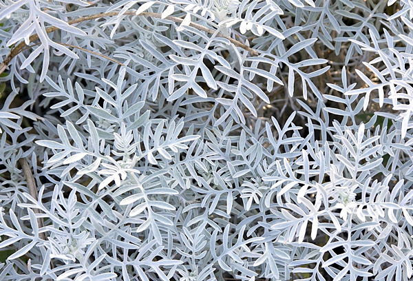 Folhas persistentes, alternas, cortadas, lobadas, espessas, na cor branco prateado com fundo verde. Em clima chuvoso ou não muito ensolarado, a aparência é cinza. Ao sol e no tempo quente, torna-se quase branco.