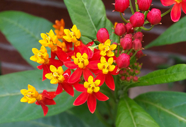 Inflorescências axilares arredondadas (cymes) com 10-20 flores cada. Flores com cinco sépalas, vermelho-alaranjadas com capuzes amarelos. Surgem quase o ano todo e atraem borboletas, abelhas e beija-flores.