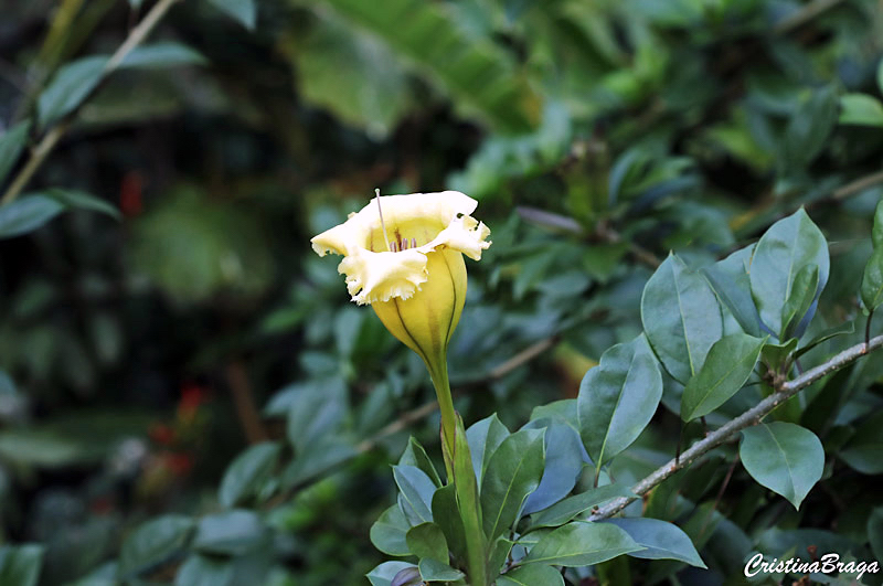 Solandra grandiflora é um “arbusto escandente”, pertence à família Solanaceae, nativo das Américas, perene, lenhoso, caducifólio, pouco ramificado, com cerca de 4 metros de altura e muito ornamental.