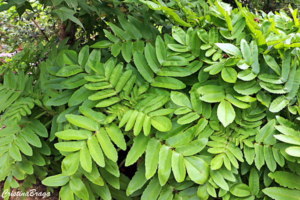 Folhas em pares opostos, verde claras e margens roxo-avermelhadas quando cultivadas sob luz forte, de 28 a 36 cm de comprimento.