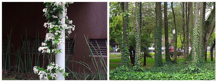 Colunas e árvores são suportes verticais ideais para trepadeiras, quando não se quer aumentar a área de sombra.