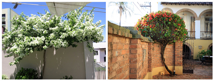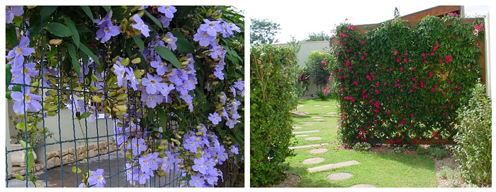 No coroamento de muro, a trepadeira precisa ser tutorada até a altura do muro, depois o troco engrossa e se sustenta e seus ramos caem transformando o muro de aparência pesada numa construção mais harmônica.