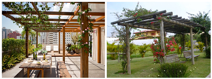 Pergolados são construções mais leves, elas podem ser de madeira, metal, concreto ou bambú, servem para proteger e criar espaços de descanso e relaxamento com integração à natureza. Podem ser colocadas em varandas, garagens, sobre bancos e jardins internos.
