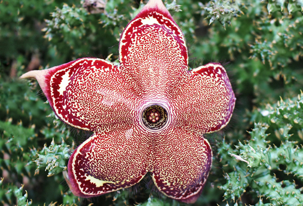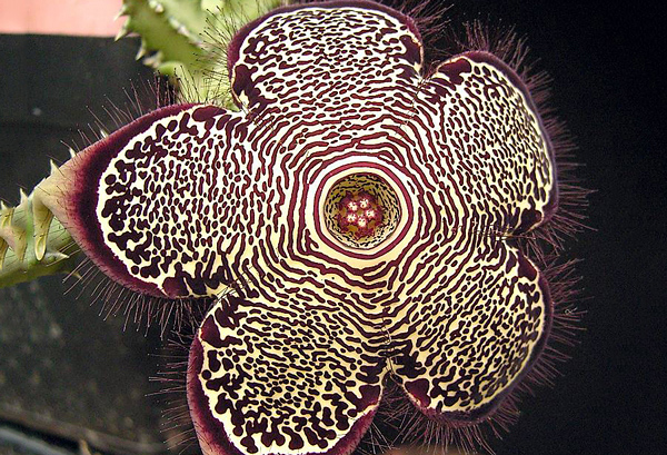As flores são terminais, exibem uma combinação de padrões intrincados, em tons de amarelo, laranja, vermelho e marrom com textura aveludada que lembram tapetes. São grandes em relação ao tamanho da planta, com cerca de 13 cm de diâmetro. São muito ornamentais, porém possuem um cheiro pútrido de carniça que atraem moscas.