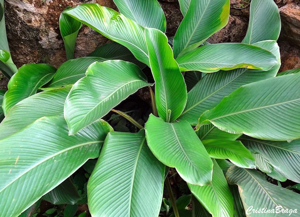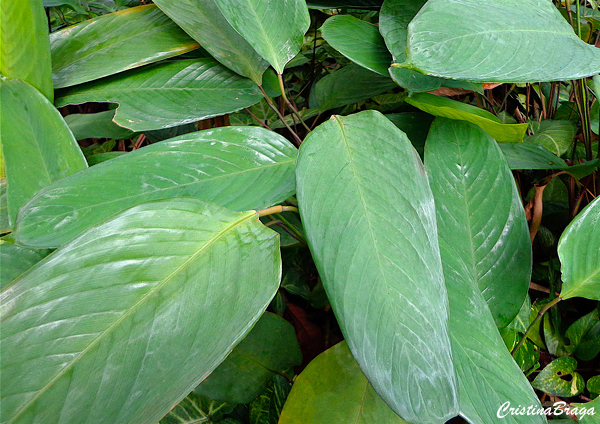 Herbácea rizomatosa, perene, robusta e vigorosa, de 0,50-1,40 m altura. Folhas em tufos, eretas, grandes, verde-clara com linhas brancas paralelas, aos pares, as quais desaparecem na fase adulta. Na face de baixo as folhas são arroxeadas. Flores sem importância ornamental.