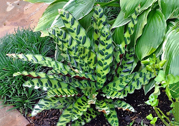 Herbácea rizomatosa, perene, forma touceiras, de 0,25-0,35 cm altura. Folhas elípticas, coriáceas, verde-acinzentada com listras transversais densas verde-escuras na face superior, existindo também uma forma pigmentada em baixo. Flores sem importância ornamental.