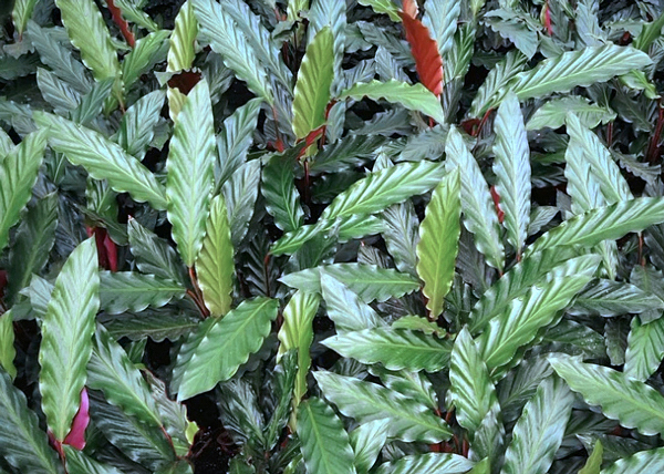 Herbácea rizomatosa, perene, de 40-60 cm de altura. Folhas verde-escuras, oblíquas e acuminadas, de margens onduladas, brilhantes na face superior, verdes ou roxas na inferior. Flores sem importância ornamental.