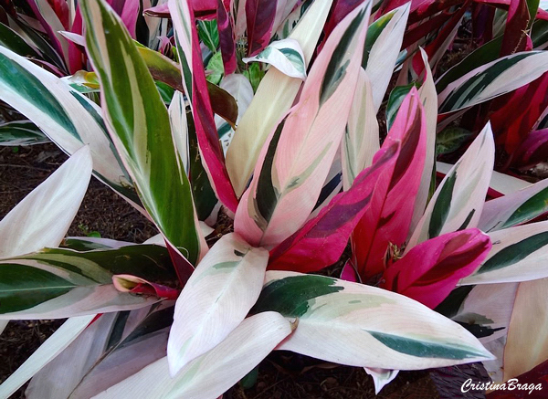 Herbácea rizomatosa, novo híbrido, perene, de 20-40 cm de altura, folhas alongadas, variegatas na cor verde-escuro, verde-claro e branco na superfície, na face inferior é arroxeado de maneira uniforme. Flores sem importância ornamental.