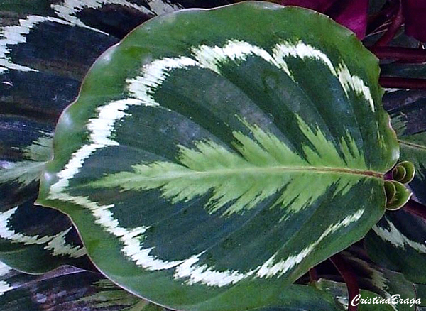 Herbácea rizomatosa, perene, de 70-80 cm de altura e apresenta a face superior das folhas com listras verde-escuras e verde-claras, dispostas alternadamente, com uma faixa rendada branco-rósea, que acompanha o contorno da margem da folha. A face inferior é de coloração púrpura. Flores sem importância ornamental.