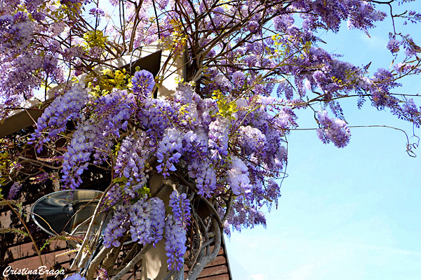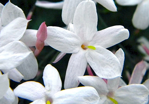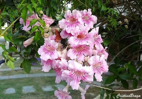 Trepadeira perene, de crescimento rápido e muito ramificada. Inflorescências ramificadas com numerosas flores perfumadas, brancas por dentro e por fora róseas. Florescem no outono-inverno.