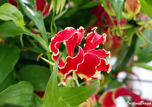Trepadeira herbacea, perene, com até 2 metros de altura. Flores com pétalas, onduladas, recurvadas, como se estivessem invertidas, são vermelhas com a base e bordas amarelas. Surgem na primavera-verão.