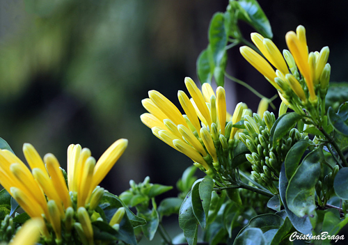 Trepadeira perene, semilenhosa, vigorosa, de ramagem densa, podendo atingir mais de 6 metros de altura. Inflorescências numerosas, densas, com flores tubulares longas, alaranjadas clara ou escuras e surgem nos meses de inverno.