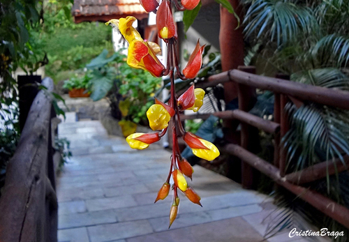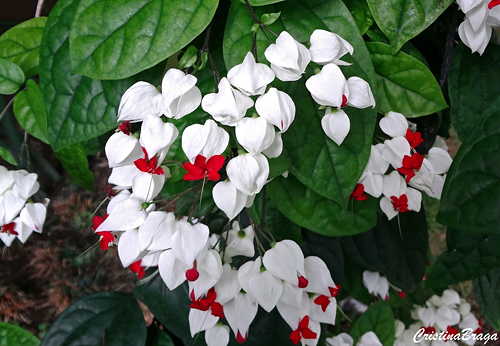 Trepadeira perene, de até 3m de altura. Inflorescências ramificadas, com muitas flores de cálice branco, inflado e corola expandida vermelha. Floresce praticamente o ano todo.