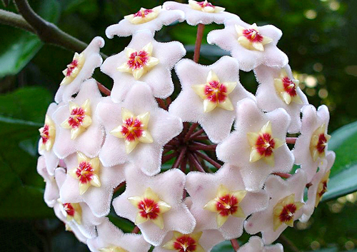 Trepadeira, perene, suculenta, podendo chegar até 5 metros de altura. Inflorescências branca a rosadas, cerosas, duradouras pendentes como pequenos buques e delicadamente perfumadas. Surgem durante a primavera-verão.