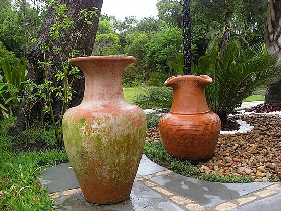 Vasos de barro, são porosos e mantêm a terra fresca por mais tempo, conferem um aspecto rústico e natural, mas tendem a ressecar no sol, por isso, a terra deve ser mantida sempre úmida.