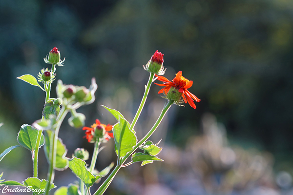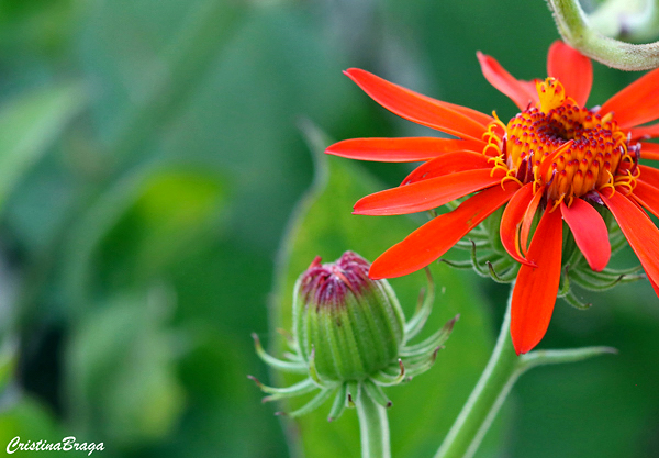 Inflorescências em capítulos grandes, solitários, dispostos sobre a folhagem, de cor vermelho-alaranjada e que lembram uma margarida com o centro amarelo. Surgem quase o ano todo, com mais intensidade na primavera-verão e são intensamente visitadas por borboletas e abelhas.