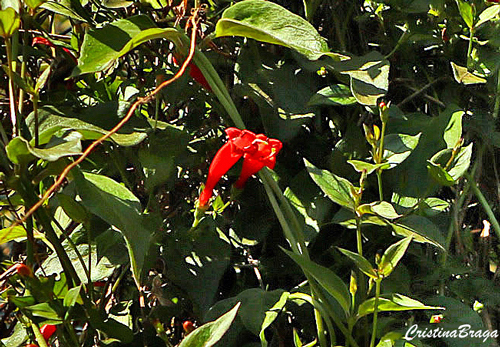 Flores solitárias ou em grupos de 2-3, axilares, de pedúnculo longo, com cálice um tanto cilíndrico e corola vermelho-carmim em forma de tubo fino, com 4 recortes reduzidos no ápice. Surgem no final do verão e outono e atraem beija-flores e borboletas.