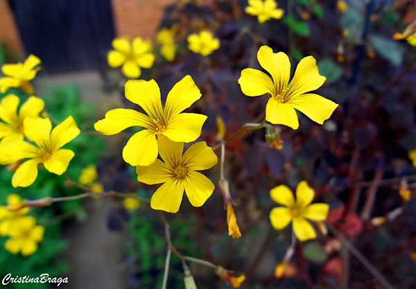 Flores pequenas, amarelas, de cinco pétalas. A garganta possui linhas finas borgonhas em perfeita harmônia com a borgonha da folhagem, são numerosas, solitárias, terminais e se projetam acima da folhagem. Surgem quase o ano todo, com mais intensidade na primavera-verão e atraem borboletas.