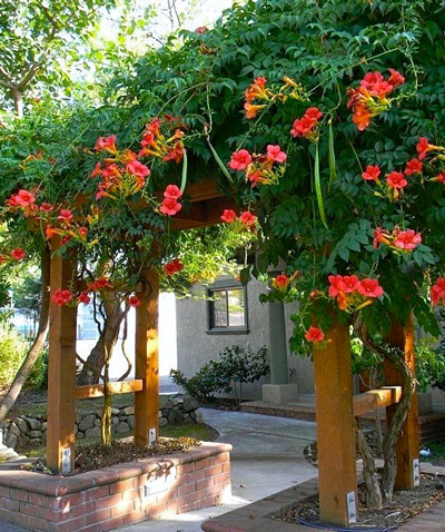 Em jardins a Trombeta Chinesa é usada apoiada em pérgulas, caramanchões, colunas, grades e cercas. Possui raízes adventícias que aderem ao suporte disponível.