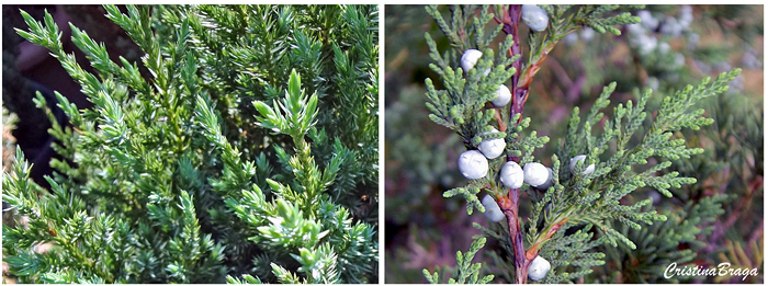 Juniperos apresentarem dois tipos de agulhas na mesma planta. Agulhas de ponta afiada e agulhas em forma de escama. Na verdade, são estágios diferentes de uma mesma folha. Quando jovens, são finas e pontudas, adquirindo mais tarde a forma de escama.