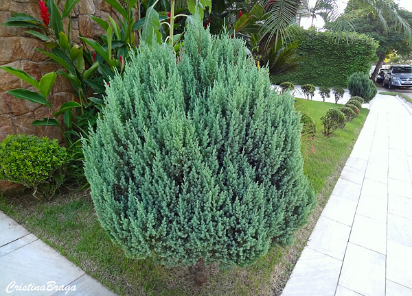 Ramos densos e ascendentes de folhas azuis e um hábito estreito e densamente colunar.