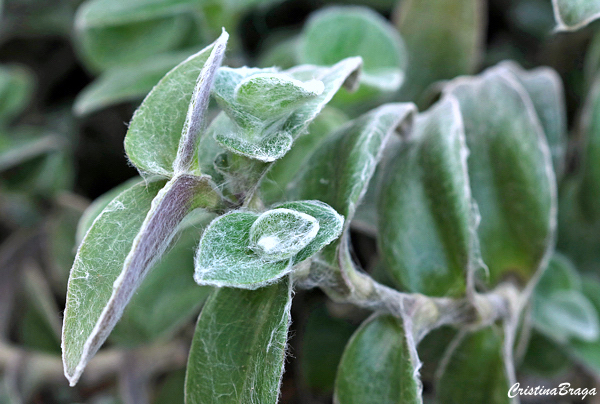 Folhas carnosas, ovais, de 2-6 cm de comprimento, de uma cor verde azeitona pálida a cinza-esverdeada e cobertas por longos pelos branco prateados.