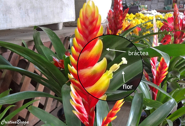 A inflorescência pode ser vertical como uma lança, pendular ou mesmo curva, as flores são pequenas e crescem dentro das brácteas. As brácteas são de cores vivas em amarelo, laranja e vermelho e são de longa duração. Normalmente, a Vriesea floresce nos períodos do verão e do outono.