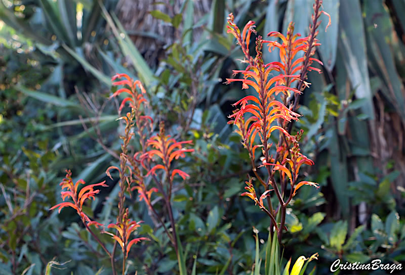 Inflorescências em espigas abertas e eretas, dispostas bem acima da folhagem, com flores vermelho-alaranjadas, de tubo recurvado na base. Surgem no verão.